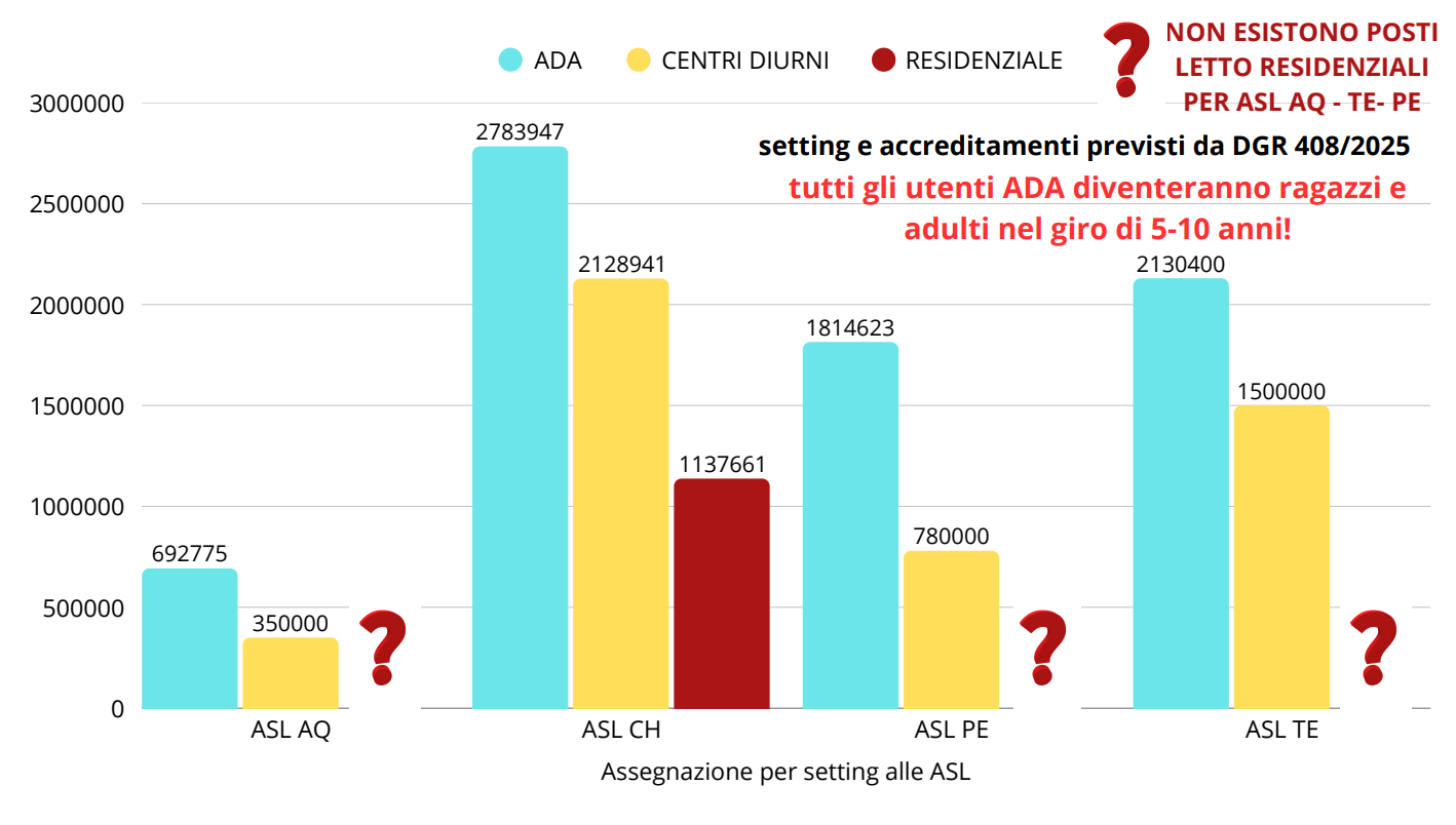 Le risorse stanziate dalla DGR 408/2025 fino a tutto il 2026 mostrano un’evidente sproporzione tra le ASL e tra i diversi setting assistenziali. L’assenza di fondi per il residenziale nelle ASL dell’Aquila, Pescara e Teramo non è un ritardo: è una scelta. Sembrerebbe invece opportuno armonizzare la ripartizione delle risorse e finanziare i posti già previsti sulla carta.