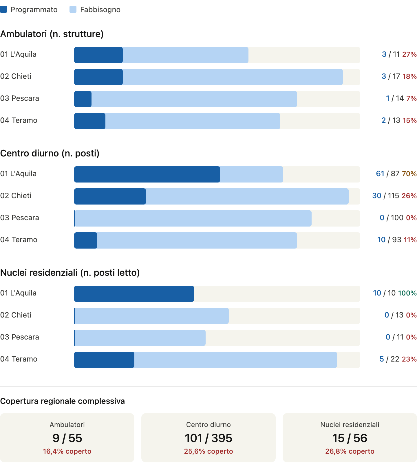 1. Un atto di finanziamento immediato dei servizi residenziali nelle tre ASL che ne sono prive (L’Aquila, Pescara, Teramo), con attivazione dei posti già previsti dalla programmazione.