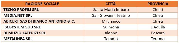 Delle 6 imprese abruzzesi in esposizione a SAIE, 3 hanno sede nella provincia di Chieti, 1 in quella de L’Aquila, 1 in quella di Pescara e 1 in quella di Teramo.